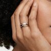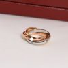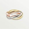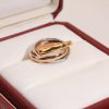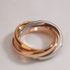 The Triple Tone Interlocking Ring celebrates modern elegance with its three-band design in yellow, rose, and white gold tones. Each band is accented with a brilliant cubic zirconia, adding a refined touch of sparkle to any occasion.