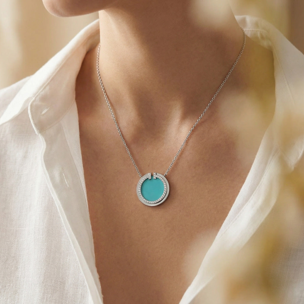 The Turquoise Circle Pendant Necklace captures the perfect balance between vibrant color and modern elegance.