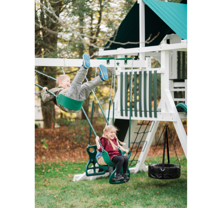 Turn your backyard into the ultimate play zone with the Twin Tower Vinyl Swing Set! This deluxe outdoor playground is built for hours of fun, adventure, and safe active play. Crafted with heavy-duty, low-maintenance vinyl, it’s designed to last while looking great in your yard.