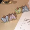 This statement design features two sculpted butterflies—one in radiant yellow tones and the other in classic white shimmer—resting delicately between the fingers to create a striking open silhouette.