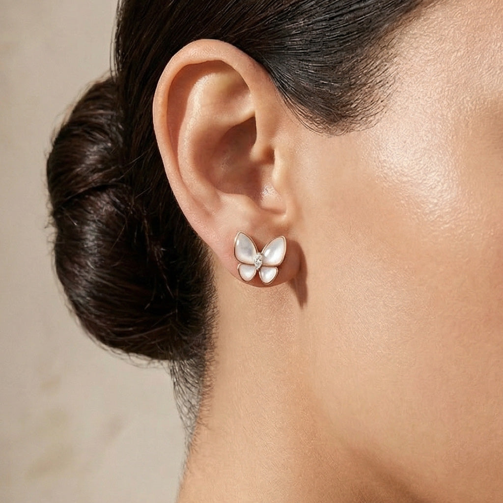 The Two Butterfly Mother Of Pearl Earrings capture refined femininity through a graceful double‑butterfly design. Each wing is crafted from luminous mother of pearl, reflecting a soft iridescence that enhances their delicate elegance.