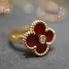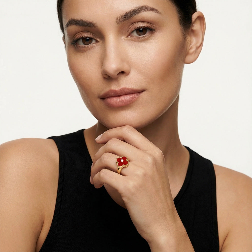 The Vintage Alhambra Carnelian Ring brings classic charm and vibrant color to any jewelry collection. Featuring a signature four-leaf clover design, it is set with a polished red carnelian stone and a central cubic zirconia (CZ) accent for a subtle touch of sparkle.