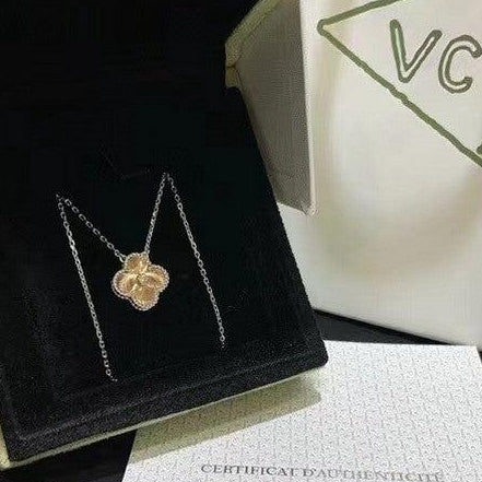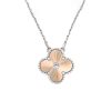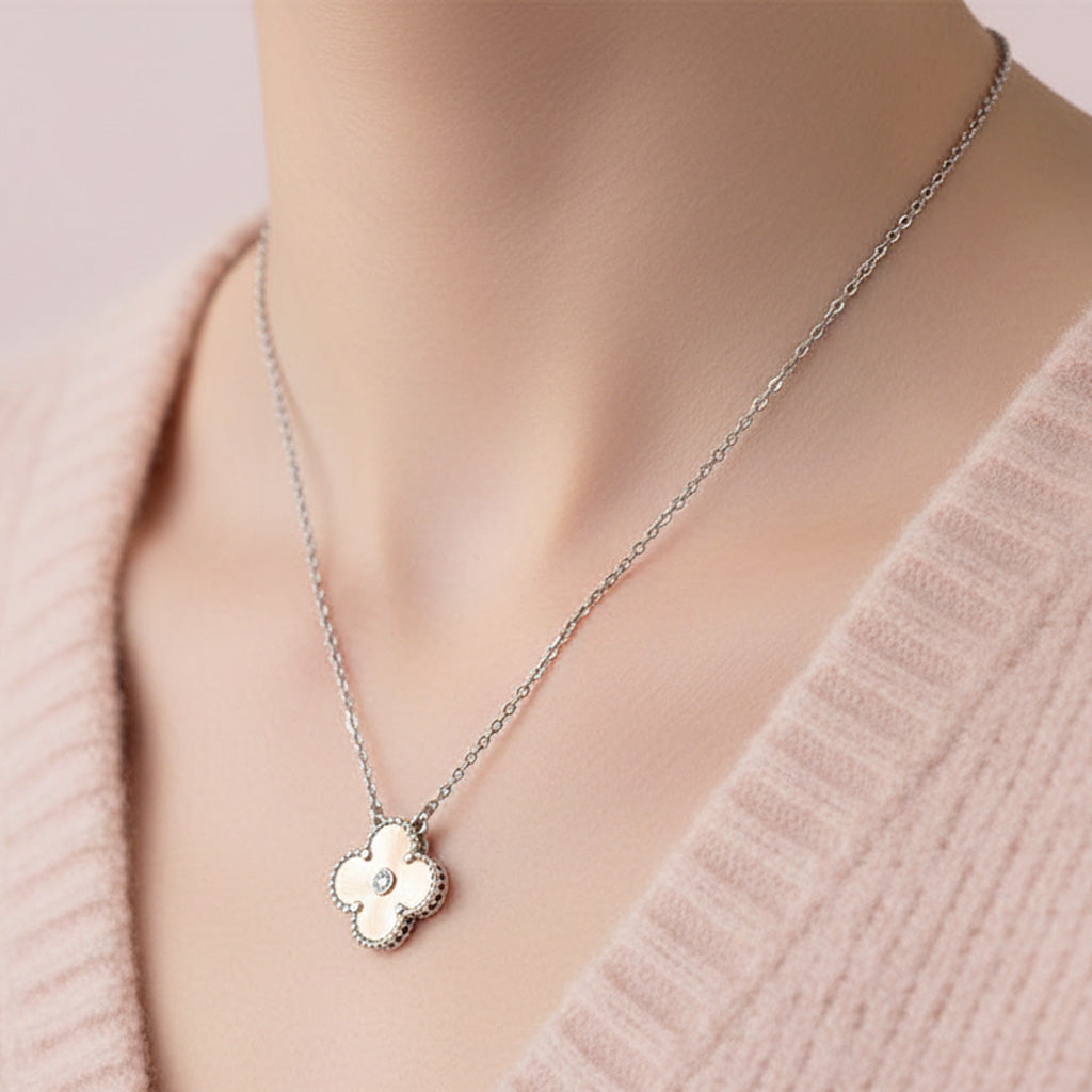 The four-petal pendant features a radiant, textured rose-toned surface accented by a sparkling cubic zirconia (CZ) center stone. Crafted from 925 sterling silver and finished in 18K white gold vermeil, it offers a bright, polished look that enhances the charm of its floral silhouette.
