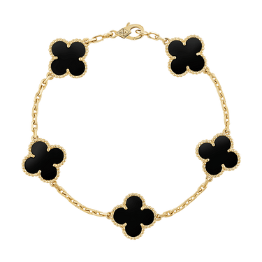 The Vintage Alhambra Five Motifs Black Clover Bracelet exudes refined charm and symbolic grace. Crafted from 18K gold vermeil over a solid 925 sterling silver base, it features a warm golden finish that enhances the bold contrast of the black clover motifs.