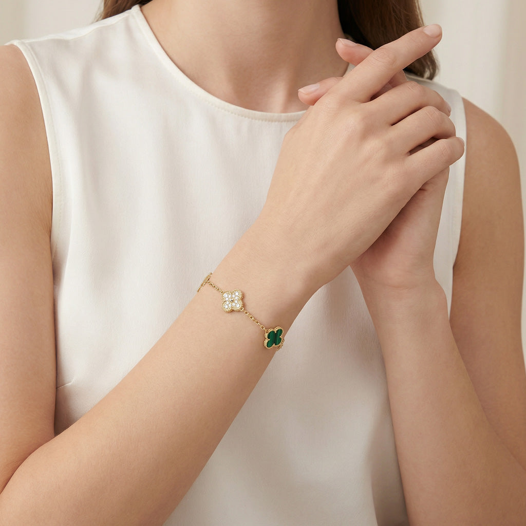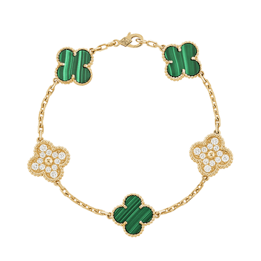 The Vintage Alhambra Five Motifs Malachite Bracelet offers a striking interpretation of balance and beauty through its five signature clover-shaped charms. Crafted with vibrant green malachite and cubic zirconia (CZ) pavé accents, each motif is thoughtfully finished to showcase the natural richness and distinct character of the materials.