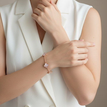The Vintage Alhambra Five Motifs Pink Opal Bracelet captures timeless beauty with its soft blush tones and symbolic clover motifs. Adorned with five interlocking pink opal charms, this bracelet embodies luck, harmony, and elegance—perfect for both everyday wear and special occasions.