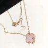 Designed in a graceful four-petal clover shape, the pendant features a soft pink mother-of-pearl inlay that beautifully reflects light and enhances its delicate charm. Crafted in 18K rose gold vermeil over a 925 sterling silver base, the necklace offers a warm, radiant finish that highlights the elegance of the clover motif.