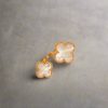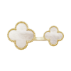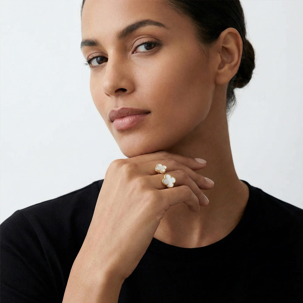 Handcrafted from solid 925 sterling silver and finished in 18K gold vermeil, this ring offers the luminous glow of gold paired with long-lasting quality. Its open-band silhouette features two clover motifs, each inlaid with natural mother-of-pearl—valued for its soft, iridescent beauty and symbolism of purity and protection.