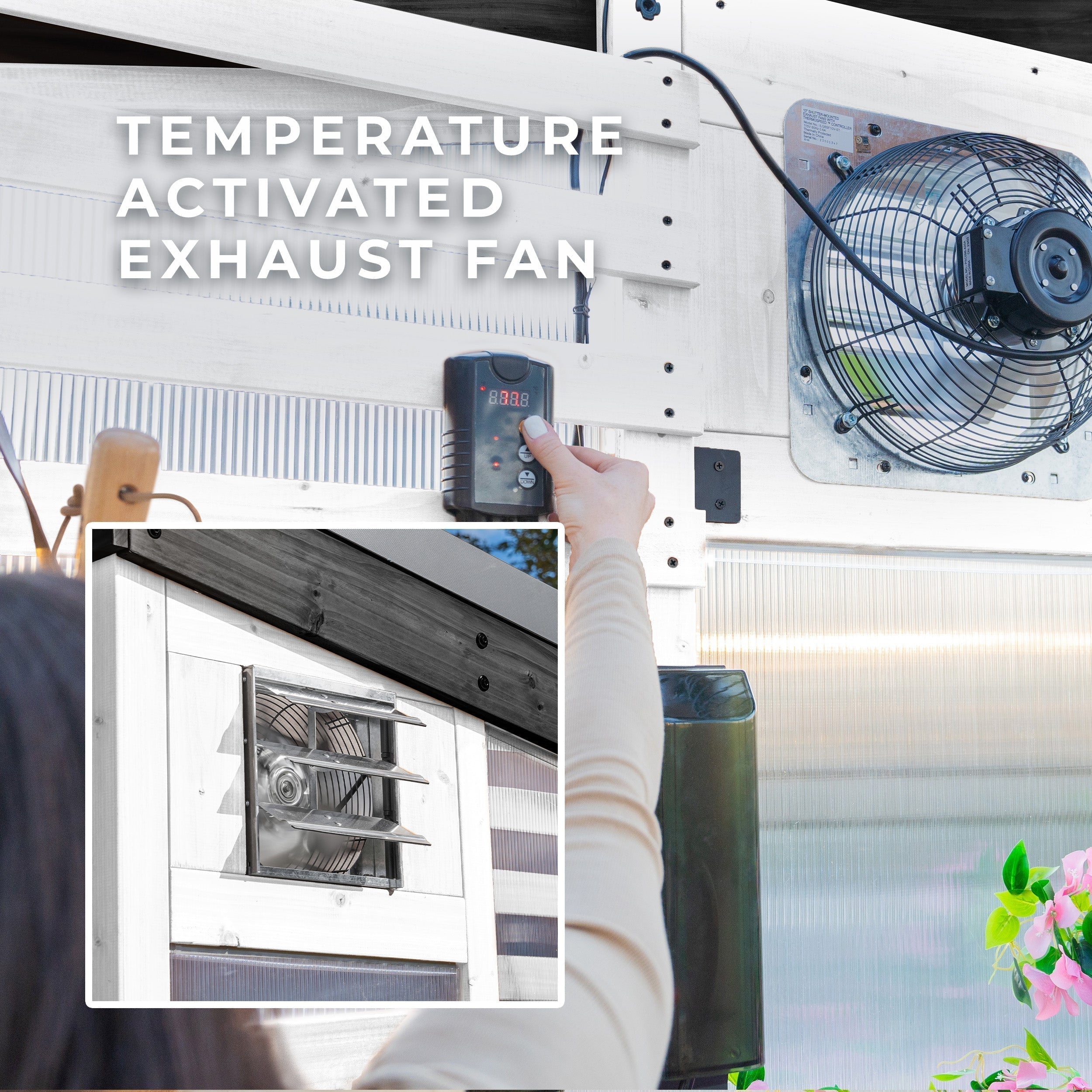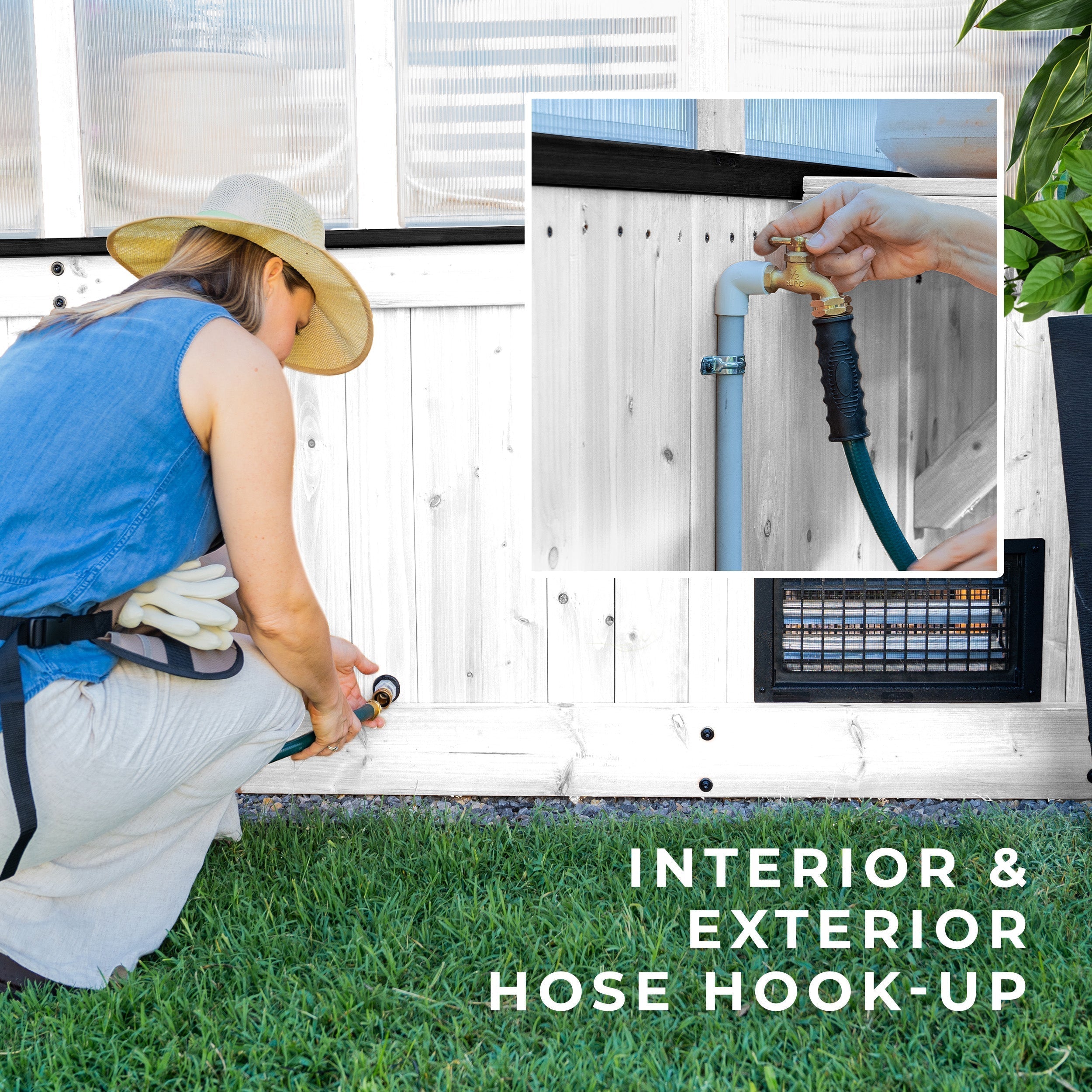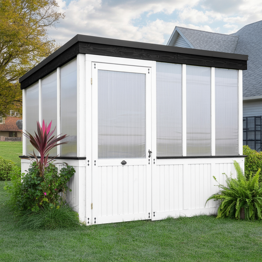 Add elegance and function to your garden with this white wooden greenhouse, featuring a modern flat roof design and black trim accents. Built with durable wood and UV-resistant polycarbonate panels, it offers a safe and stylish space for your plants to thrive year-round.