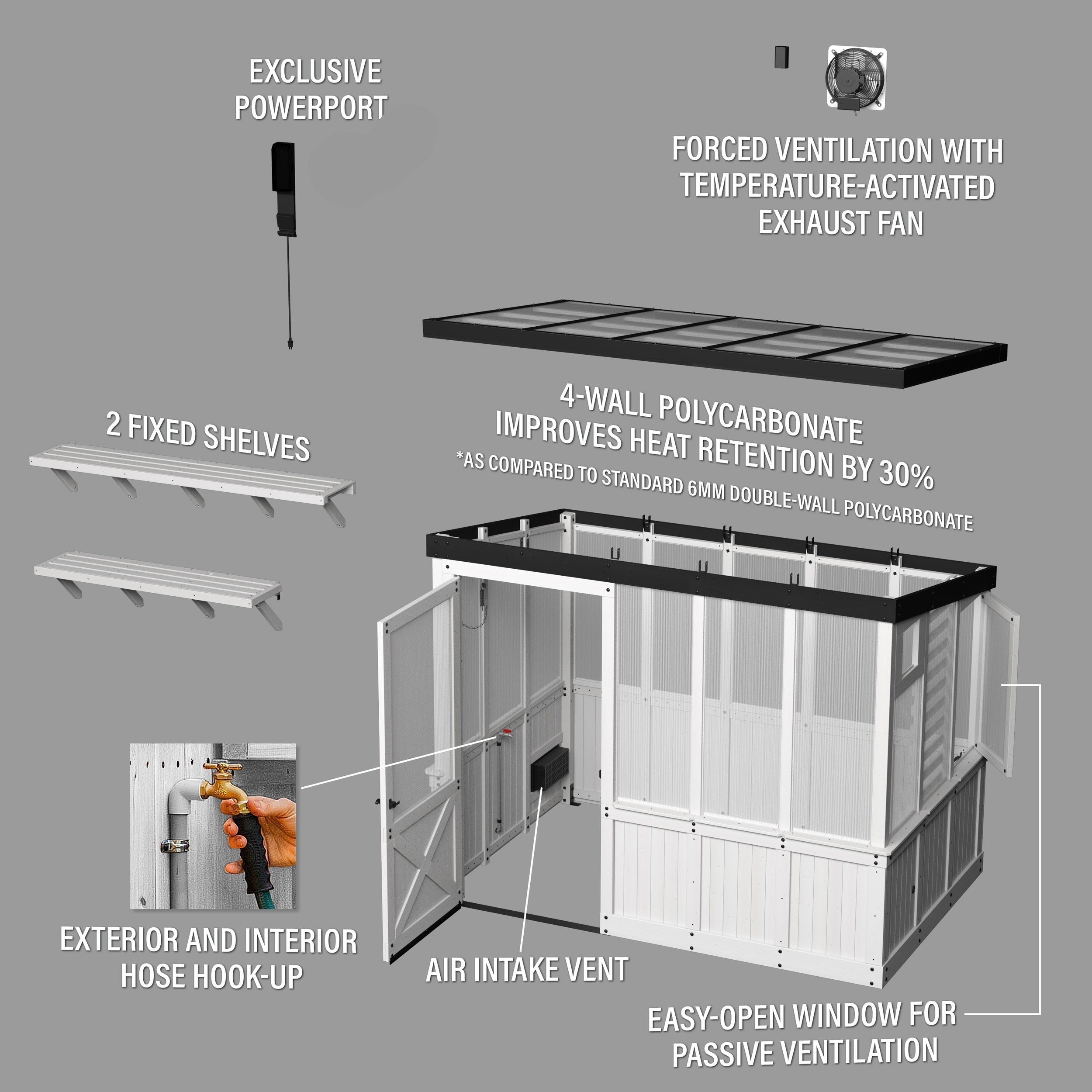 White Wooden Greenhouse – Flat Roof Outdoor Garden Greenhouse with Polycarbonate Panels