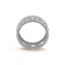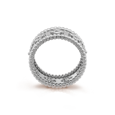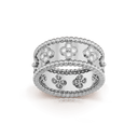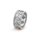 Delicate four-leaf clover motifs are formed with precision-set cubic zirconia (CZ) stones, creating a floral-inspired shimmer across the surface. The polished inner band offers a smooth feel, making this ring an ideal choice for elevating everyday looks or adding a sophisticated touch to special occasions.