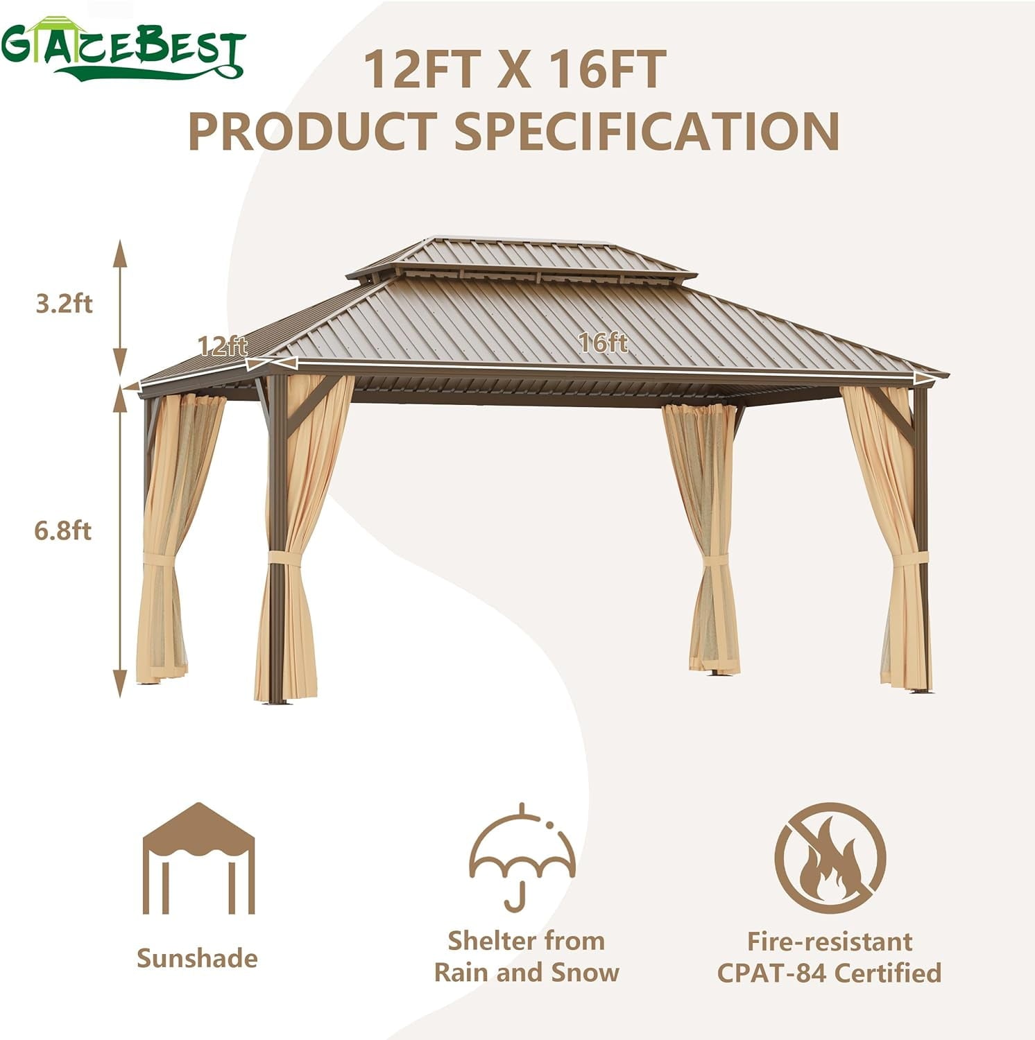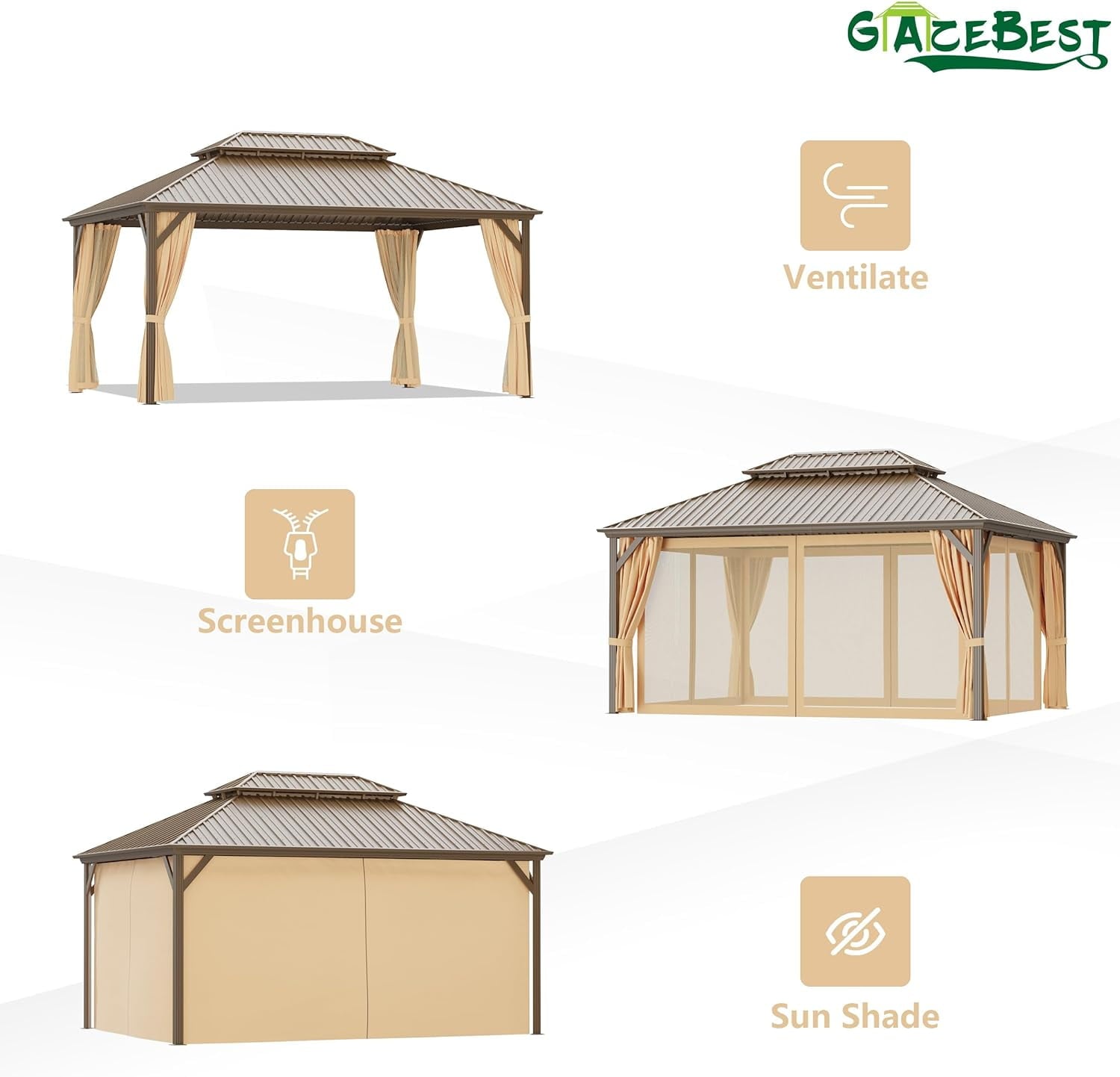 R 12' x 16' Hardtop Gazebo, Brown, Double Roof, Galvanized Steel, Netting & Curtains