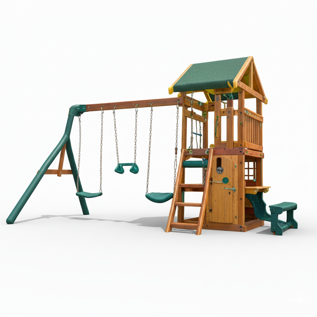 This compact yet complete wooden playset combines climbing, swinging, and social play in one backyard-ready design. A safe, fun, and space-saving way to create lasting family memories outdoors.