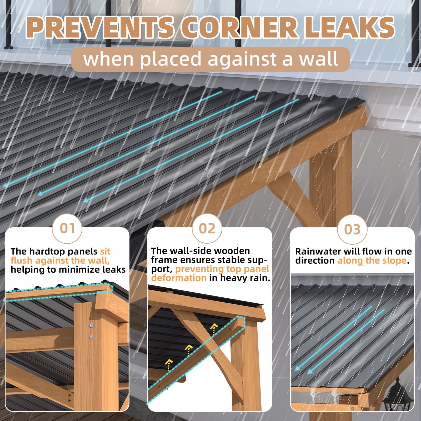 Enhance your patio or backyard with this elegant lean-to gazebo. Built with a strong wooden frame and a sleek black steel roof, it provides reliable protection while blending seamlessly with modern and traditional home designs.