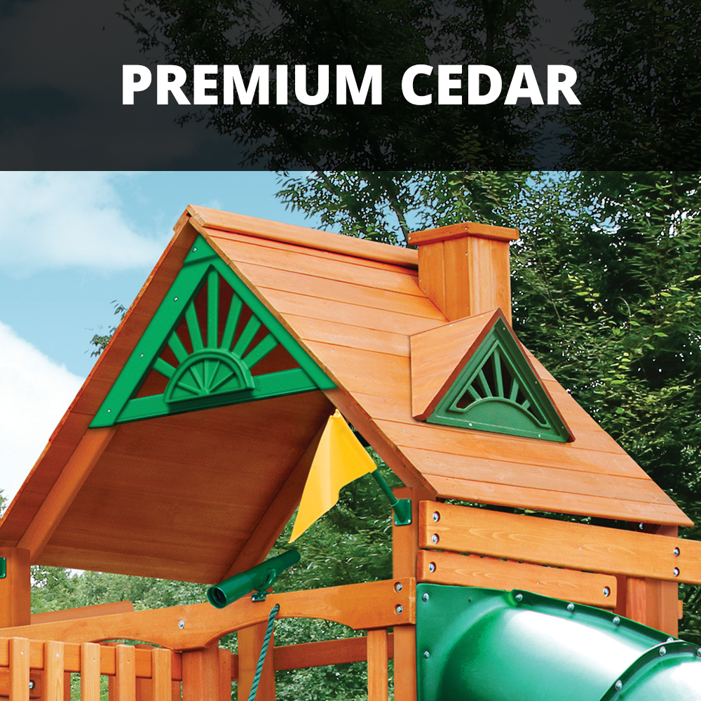 Our playsets are built from sustainably sourced cedar wood. We also make almost all our slides here in the US with 100% recyclable plastic. We gather all the plastic scraps and any defects from the slide formation process, and they are melted back into plastic sheets to be reused.
