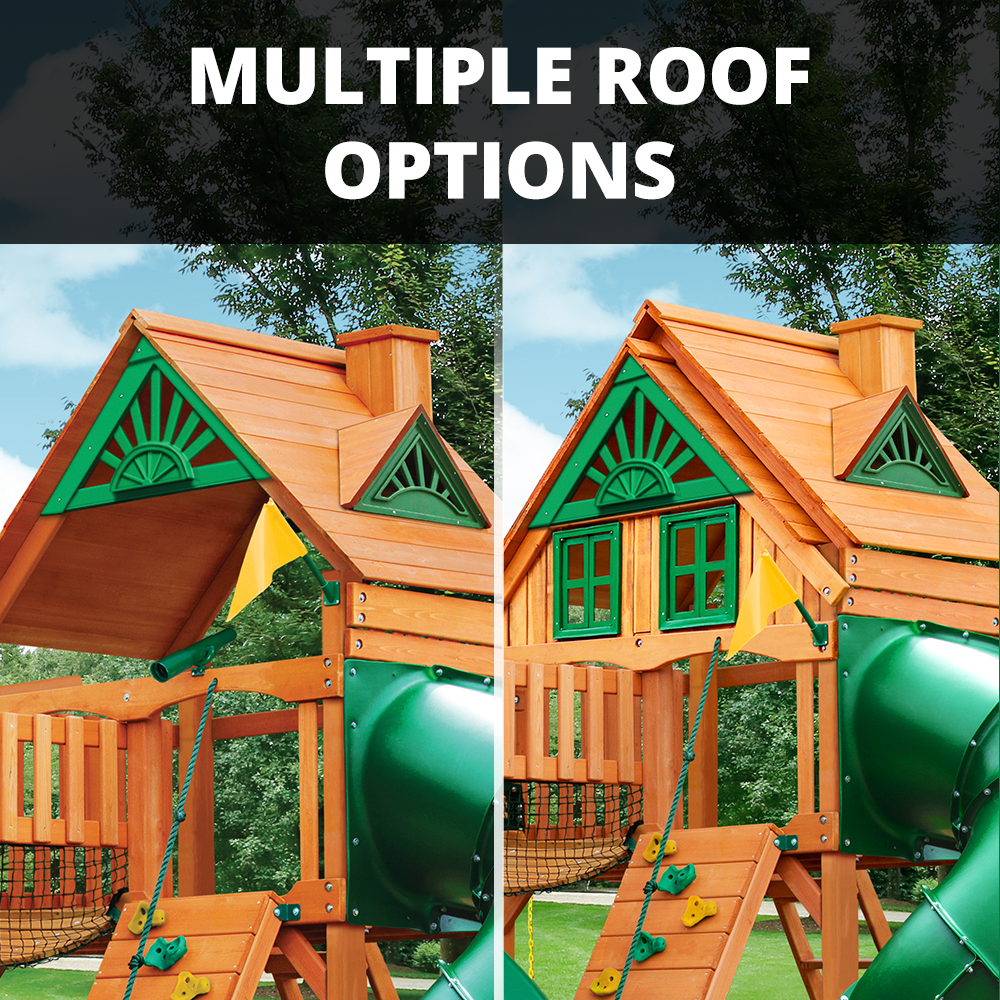 Bring adventure home with this wooden swing set and playhouse, featuring dual slides, rock climbing wall, swings, and a clubhouse for endless backyard fun.