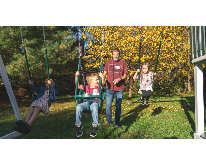 Our playsets are built from sustainably sourced cedar wood. We also make almost all our slides here in the US with 100% recyclable plastic. We gather all the plastic scraps and any defects from the slide formation process, and they are melted back into plastic sheets to be reused.
