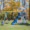 This all-in-one wooden playset features swings, slide, climbing areas, and a raised clubhouse – built for safe, active, and imaginative backyard fun.