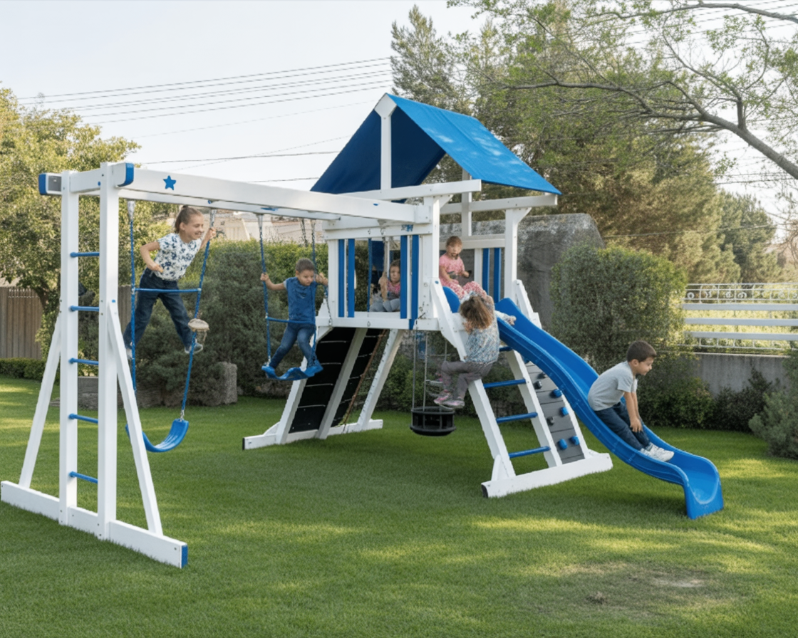This complete playground encourages imagination, physical activity, and teamwork. Perfect for families who want to create a fun and safe outdoor play space for their children.